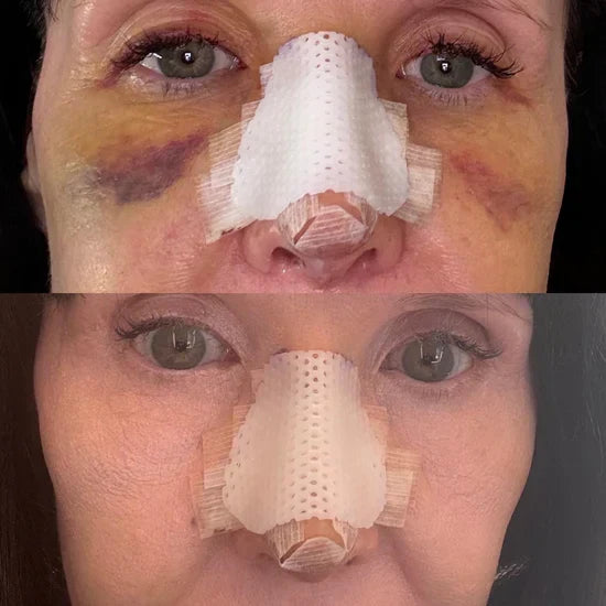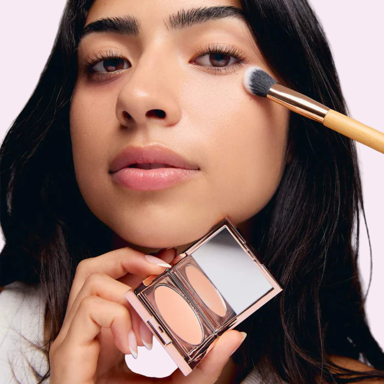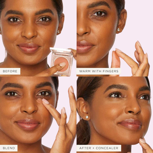 Pat a rice-grain amount under each eye with your ring finger, gently blending over any areas with darkness, redness, or scarring.